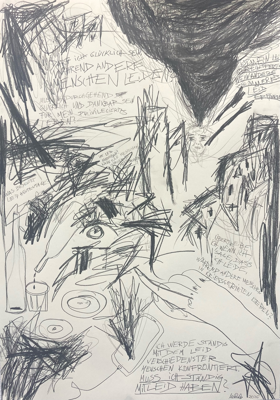 Die Werkreihe „Leid" erzeugt ein Gefühl von Machtlosigkeit und Überforderung, denen Betrachtende direkt ausgesetzt sind. In den drei Zeichnungen thematisiere ich meinen Gefühlszustand, der sich in mir einstellt, wenn ich Leid auf der Welt beobachte – sei es lediglich Ungerechtigkeit, Krieg, Tod, Flucht.