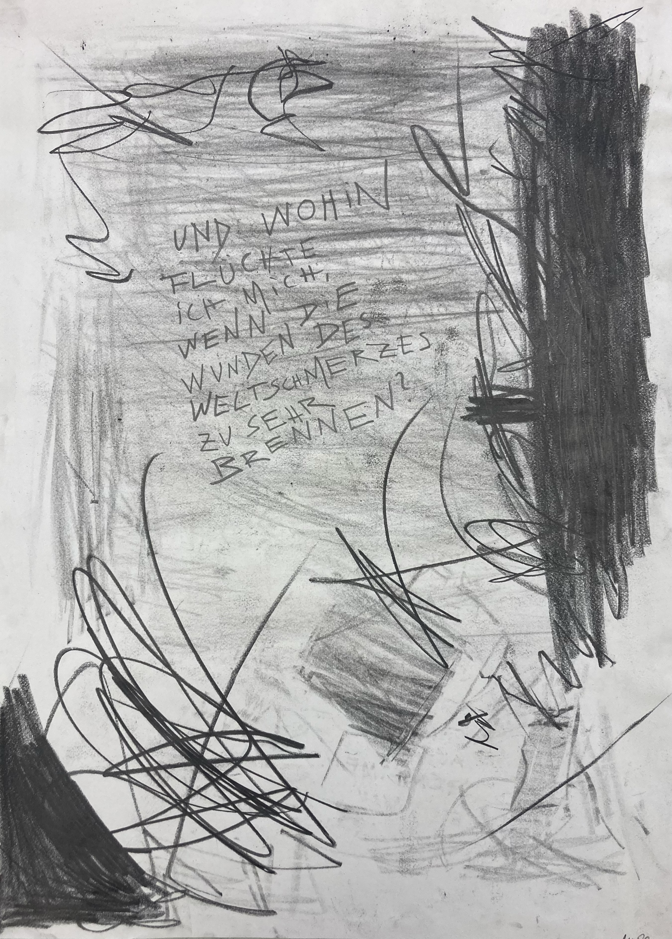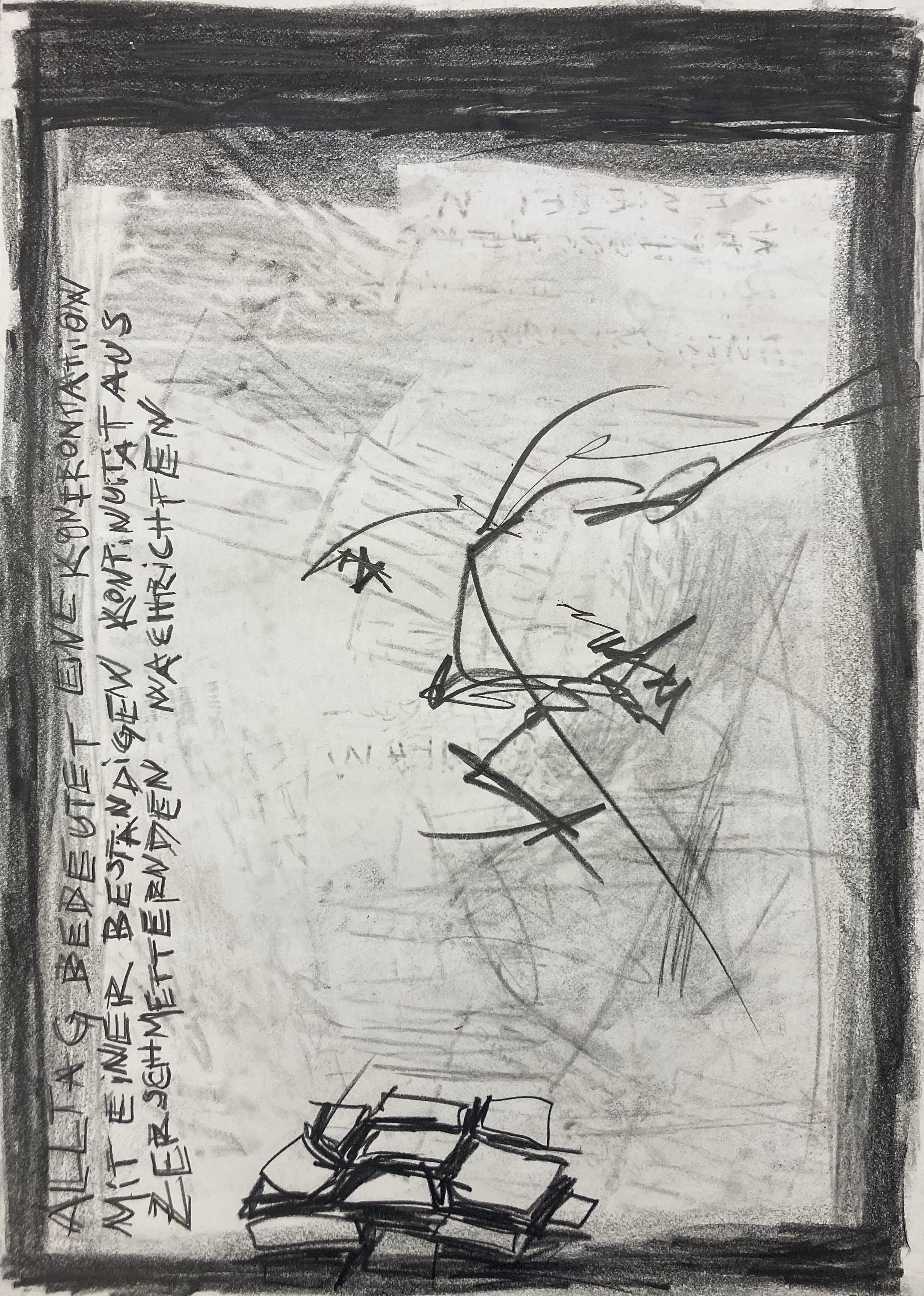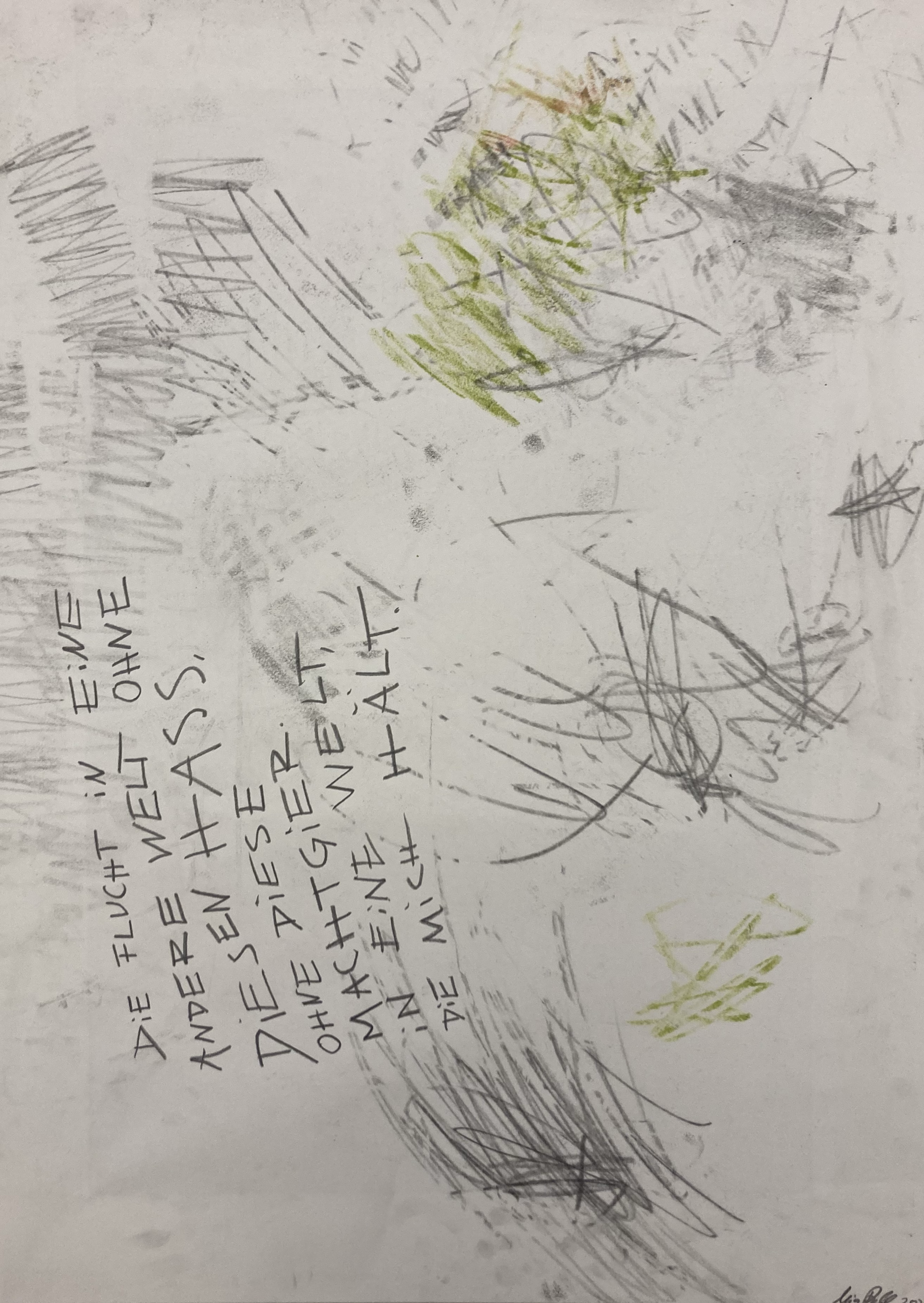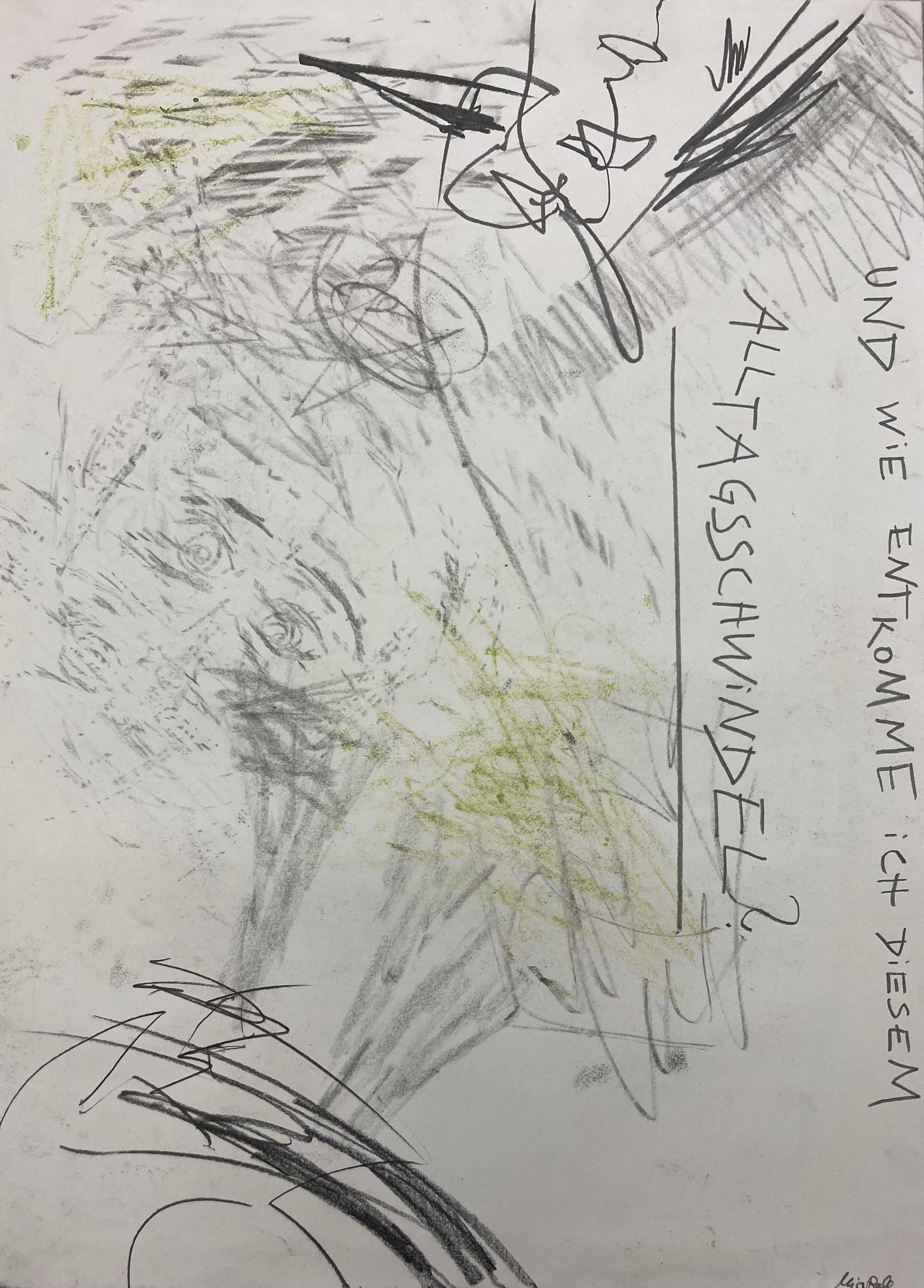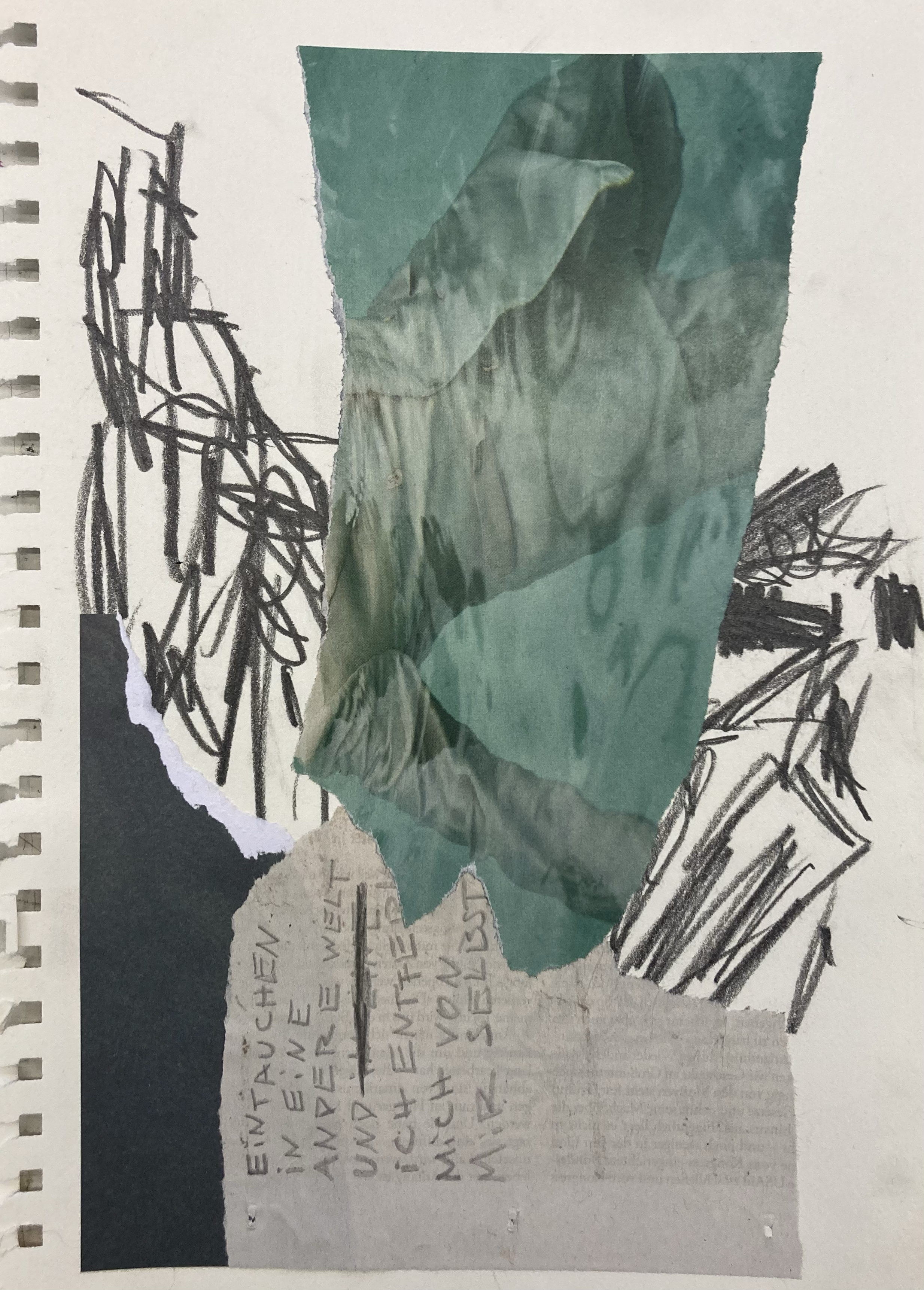 Die Flucht vor dem Zustand dieser Welt. Hiermit thematisiert die Werkreihe „Wenn die Welt zu viel wird“, bestehend aus elf Zeichnungen und fünf Collagen, den Auslöser des Eskapismus. Das Gefangensein im Doomscrolling tritt als Realitätsverlust auf, welcher sich inErschöpfung, Angst und Überforderung sowie Antriebslosigkeit begründet.